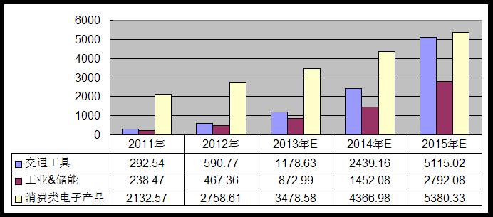 在這個市場,鋰離子電池需求的增長主要來自于兩方面:一是產(chǎn)品本身的智能升級對電池用量的需求在增長;二是新產(chǎn)品產(chǎn)生了新的市場需求。對于傳統(tǒng)功能手機(jī),可能700mAh的電池就足夠了,但對于智能手機(jī),2000mAh都顯得不夠。至于后者,突出的例子是平板電腦產(chǎn)品自2010年推出以來,到2012年迅速取得了1.3億臺的年銷量,為智能手機(jī)、平板電腦等充電的移動電源產(chǎn)品市場2012年極其火爆,銷量達(dá)到了驚人的100多萬kWh,是2011年的數(shù)倍。