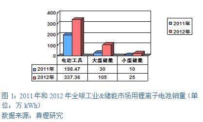工業(yè)&儲能市場的發(fā)展情況與交通工具領(lǐng)域類似。2012年全球工業(yè)&儲能市場所需的鋰離子電池總量為467.36萬kWh,總量占比只有12.25%,但較2011年的238.47萬kWh增長了95.98%,其增量在2012年1153.16萬kWh的絕對增量中占到了19.85%。