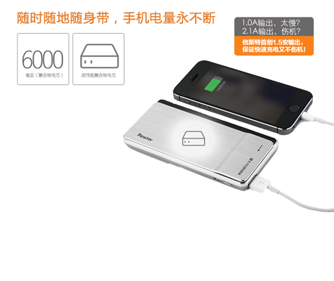 高性能聚合物鋰電芯,鑄就高品質移動電源。6000毫安充足容量,隨時隨地為你的手機充電,確保您的信息流永遠暢通,確保你的精彩人生永不斷電。