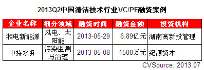 表1 2013Q2中國清潔技術行業VC/PE融資案例