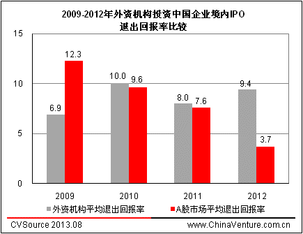 圖5 2009-2012年外資機構投資中國企業(yè)境內IPO退出回報率比較