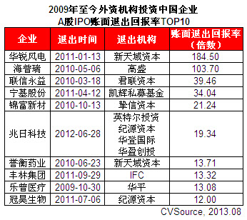 表2 2009年至今外資機構投資中國企業(yè)A股IPO賬面退出回報TOP10