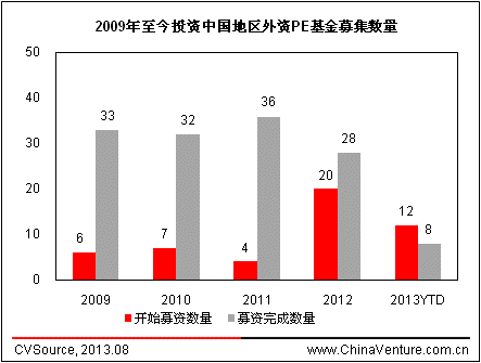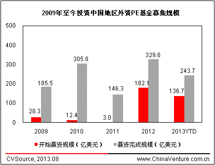 根據(jù)ChinaVenture投中集團旗下金融數(shù)據(jù)產品CVSource 統(tǒng)計顯示,2009-2011年投資中國地區(qū)的外資PE基金成立數(shù)量和目標規(guī)模整體處于較低水平,2012年呈現(xiàn)爆發(fā)式增長,全年共披露20支外資PE基金成立并開始募集,總計目標規(guī)模182.1億美元。2013年至今,共披露12支外資PE基金成立并開始募集,總計目標規(guī)模136.7億美元,新基金成立仍較為活躍。