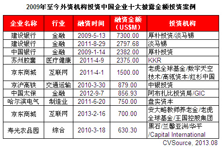 表1 2009年至今外資機構投資中國企業(yè)十大披露金額投資案例
