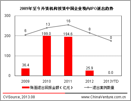 根據(jù)ChinaVenture投中集團旗下數(shù)據(jù)產品CVSource統(tǒng)計顯示,2009-2011年,外資機構投資中國企業(yè)A股IPO退出案例數(shù)量逐年上升,2011年達到了16起,創(chuàng)下歷年新高。2010年和2011年累計賬面退出金額分別為199.0億元、194.6億元。其中,2011年的華銳風電,2010年的海普瑞與九州通(兩家加總)為外資機構帶來的賬面回報均超過100億元,在當年統(tǒng)計數(shù)據(jù)中占據(jù)重要地位。2012年以來,在宏觀經濟及資本市場缺乏利好因素的形勢下,PE市場持續(xù)低迷,退出渠道有所收窄。2012年,外資機構投資中國企業(yè)A股IPO退出案例僅有8起,累計實現(xiàn)賬面退出金額25.9億元,退出案例數(shù)量和退出金額均出現(xiàn)大幅下滑。2013年,A股IPO持續(xù)冰封,沒有企業(yè)實現(xiàn)IPO退出(見圖4)。