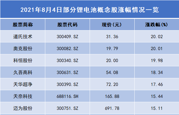鋰電池板塊上演漲停潮 道氏技術(shù)/奧克股份漲幅逾20%