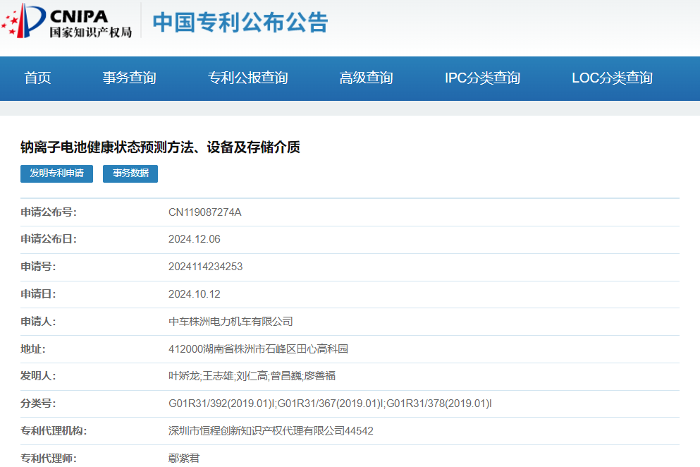 中車(chē)株機(jī)申請(qǐng)鈉電池健康狀態(tài)預(yù)測(cè)專(zhuān)利
