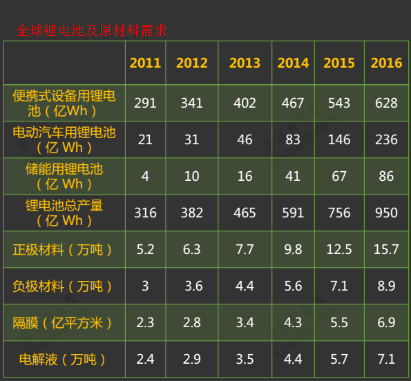 根據(jù)慧博資訊最新研報(bào),需求沖擊導(dǎo)致2015年全球供需平衡表出現(xiàn)了9100噸碳酸鋰短缺。按中國(guó)全年30萬(wàn)輛、歐洲和美國(guó)市場(chǎng)最新銷(xiāo)量重估全年需求,全球新能源汽車(chē)對(duì)碳酸鋰需求已爆發(fā)至3.86萬(wàn)噸,較市場(chǎng)普遍預(yù)期暴增1.13萬(wàn)噸。2015年全球碳酸鋰需求預(yù)計(jì)為21.18萬(wàn)噸,同比增速19.64%。除新能源汽車(chē)外,工業(yè)需求12.3萬(wàn)噸,3C數(shù)碼消費(fèi)品需求5 萬(wàn)噸,儲(chǔ)能需求1700噸。由于生產(chǎn)工藝、成本偏高等因素,今年多處產(chǎn)能未能充分釋放,預(yù)計(jì)2015年全球鹽湖/礦山提鋰的總產(chǎn)量?jī)H20.28萬(wàn)噸。 2016年-2018年全球碳酸鋰需求預(yù)計(jì)分別為24.42萬(wàn)噸、28.89萬(wàn)噸和34.10萬(wàn)噸,對(duì)應(yīng)增速18.3%、18.0%和19.9%。增長(zhǎng)的動(dòng)力主要來(lái)自新能源汽車(chē),若中國(guó)新能源汽車(chē)產(chǎn)量增速維持100%增長(zhǎng),即使考慮動(dòng)力電池能量密度上升,2016-2018年全球新能源汽車(chē)碳酸鋰需求還將上升至6.41萬(wàn)噸、9.76萬(wàn)噸和13.67萬(wàn)噸。
