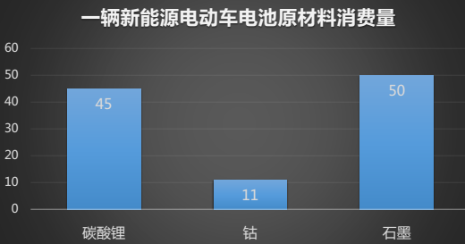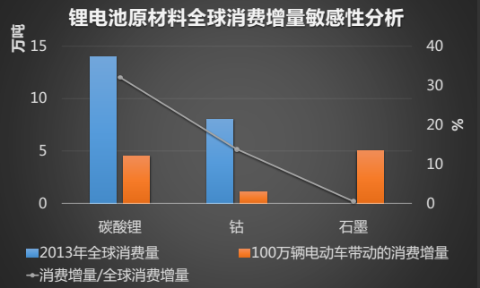 一輛電動車的三種原料消費量:45千克碳酸鋰、11千克鈷、50千克石墨。我們以特斯拉ModelS為例,測算了電動車中三種主要金屬元素的含量。同時按電動車年銷量增長100萬輛為基準,做原材料的消費增量敏感性分析,可得出碳酸鋰消費增量4.5萬噸,現消費量14萬噸/年;鈷消費增量1.1萬噸,現消費量8萬噸/年;石墨消費增量5萬噸,現消費量巨大但無準確數字。