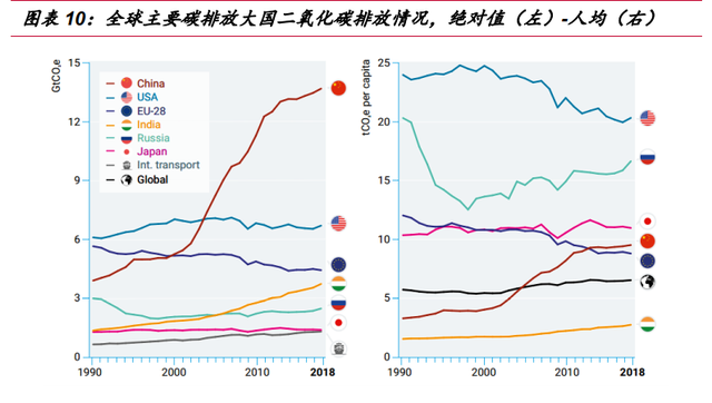 我國減排任務(wù)艱巨,年排放量位居世界第一。根據(jù)聯(lián)合國數(shù)據(jù),2018 年中國碳 排放達(dá)到 137 億噸,同比增長 1.6%。盡管我國碳排放的增速已經(jīng)放緩,但從總量看, 占全球總排放量的 1/4 以上,仍是全球排名第一的碳排放國。作為世界工廠,在產(chǎn)業(yè) 鏈日趨完善、國產(chǎn)制造加工能力與日俱增的同時,我國的碳排放量也快速攀升。作為 負(fù)責(zé)任的大國,走低碳節(jié)能發(fā)展之路既是我國的責(zé)任所系,亦是使命所向。