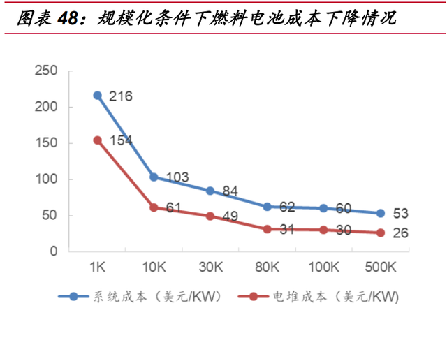 目前在下游系統、電堆環節,國產企業已經實現產品批量供應,隨著膜電極國產 化的逐步深入,燃料電池產業鏈已經基本實現國產化。但產業鏈中質子交換膜、碳紙 等材料環節仍處于研發或小批量試制階段,持續引導國產化推進,實現技術獨立可控 對成本下降意義重大。此外由于產業規模尚小,同時 MEA 等部件國產化時點較晚, 造成目前除了系統、電堆龍頭企業外,大部分國產化產品尚未能形成大規模,長周期 應用,政策扶持期將提供國產部件的規模化應用及技術提升的空間。