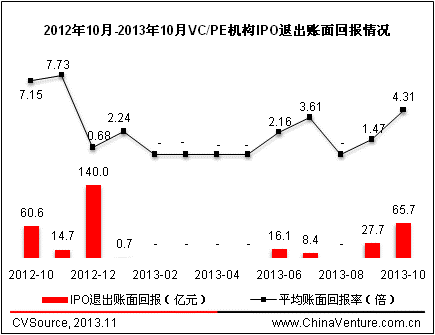 2013年10月,共有16家中國企業(yè)完成IPO,累計融資65.6億元,IPO企業(yè)數(shù)量連續(xù)兩月增加,創(chuàng)下年內(nèi)新高。機構(gòu)退出方面,2013年10月,共有4家VC/PE背景企業(yè)成功登陸資本市場,合計融資38.4億元,占比達到58.6%;10家投資機構(gòu)共實現(xiàn)10筆退出,合計獲得賬面退出回報65.7億元,平均賬面回報率為4.31倍,IPO退出平均賬面回報率企穩(wěn)回升。