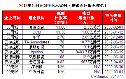 表2 2013年10月VC/PE退出案例(按賬面回報率排名)