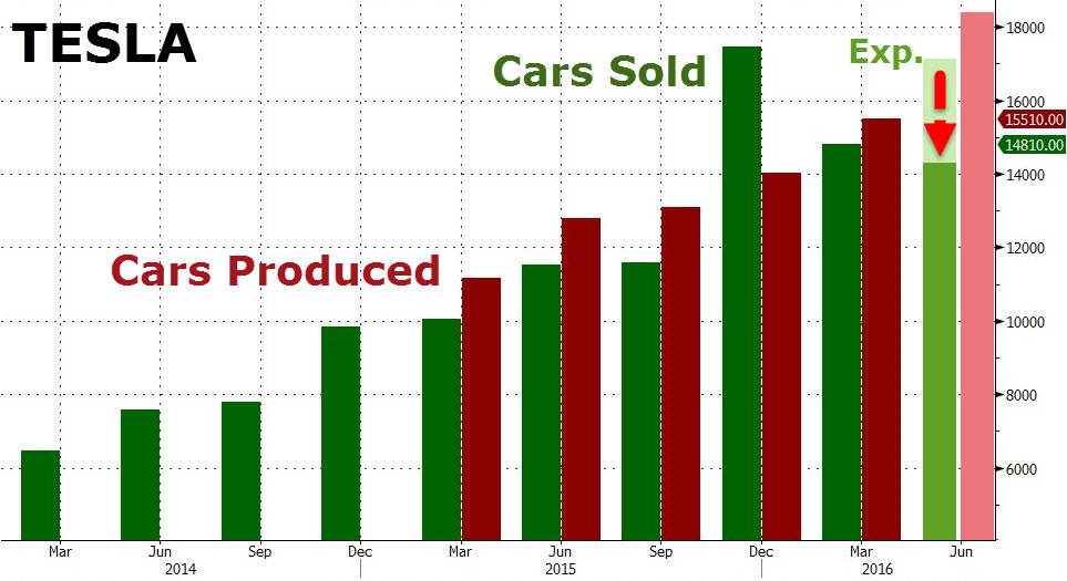 如金融博客Zerohedge下圖所示,二季度特斯拉不但出貨量與預期相差很大,比預期少出貨約15%,而且該司史上首次出現出貨量環比下滑。