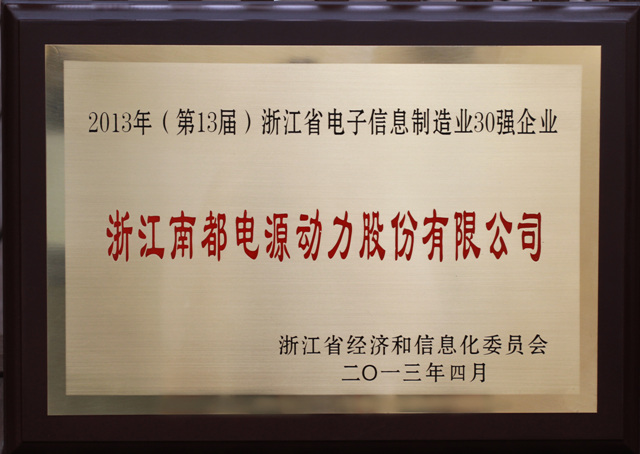 日前,在2013年上半年浙江省電子信息行業經濟形勢分析和業務培訓會議上,頒布了2013年全省電子信息產業50強優勢企業,包括30家電子信息制造業企業、10家外貿出口企業、10家軟件企業。浙江南都電源動力股份有限公司入圍2013年電子信息制造業30強企業。