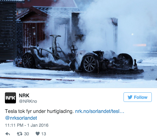 據外媒 F.drelandsvennen 的報道,周五早上一輛特斯拉 Model S 在超級充電站充電時突然起火。所幸事故發生后沒有人員傷亡。