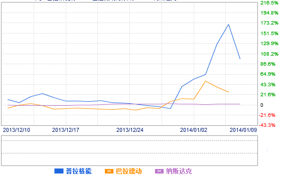 受上述利好消息的帶動,美股中燃料電池相關(guān)股票大漲。自12月底以來,在納斯達(dá)克指數(shù)并未出現(xiàn)大幅波動情況下,美股普拉格能源從12月31日的1.55美元/股,一路攀升至1月8日(周三)的高位4.52美元/股,累計漲幅191.61%;另一只在美國納斯達(dá)克上市的燃料電池股票巴拉德動力系統(tǒng)(NASDAQ:BLDP)也從12月31日1.52美元/股,累漲63.82%,至1月7日(周二)的2.49美元/股。