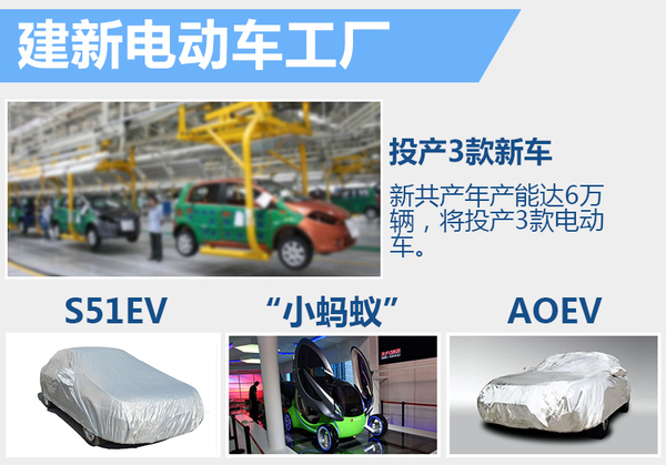 奇瑞新電動車生產項目位于蕪湖弋江區高新技術開發區,項目總投資15.6億元人民幣,由奇瑞汽車股份有限公司獨資建設,有望于年內正式投產。新工廠將投產鋁車身骨架純電動乘用車,年產能可達6萬輛,主要生產S51EV、小螞蟻、AOEV等系列電動車。此外新工廠投產后,將成為奇瑞兌現年產20萬輛新能源車產能目標的重要一環。
