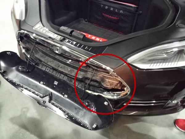 工作人員拆開了車的前唇蓋,而拖車鉤就隱藏在其右側的空隙內 車廂應急逃脫 在Model S前后兩個車廂,特斯拉都安裝了應急按鈕,這是為了防止發生意外被