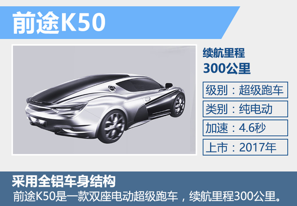 前途K50作為一款雙座超級純電動跑車,百公里加速4.6秒。續(xù)航里程300公里。車身采用全鋁合金框架式結(jié)構(gòu),極大程度的降低了車身重量。其80%的車身框架均采用高強(qiáng)度擠壓鋁合金型材工藝保證了產(chǎn)品的制造精度,同時降低了產(chǎn)品制造成本。此外,通過創(chuàng)新的模塊化電池箱設(shè)計,使車輛具備充電、換電兩種使用模式的切換功能。