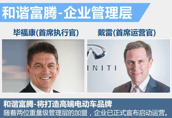 日前,和諧富騰互聯網加智能電動汽車公司(以下簡稱:和諧富騰)正式宣布,曾任職寶馬集團新一代電動超級跑車i8項目總監畢福康博士(Dr. Carsten Breitfeld)加盟,并擔任企業首席執行官。不久前,從剛剛卸任東風英菲尼迪總經理的戴雷,出任和諧富騰首席運營官,隨著兩位重量級管理層的加盟,企業已正式宣布啟動運營。