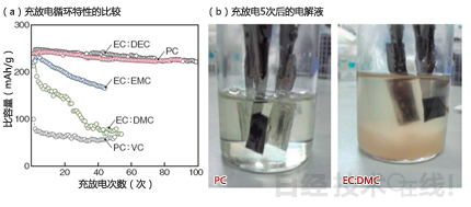 東京理科大學通過將PC和EC:DEC用于電解液,實現了充放電循環特性出色的鈉離子充電電池,并于2009年春進行了相關發表(a)。如果是鋰離子充電電池利用的EC:DMC的話,電解液立即就會劣化(b)。(圖由《日經電子》根據東京理科大學的資料制作)