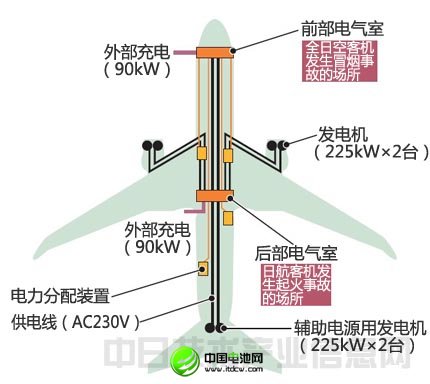 圖2:日航客機和全日空客機發生異常的位置不同 787客機有前后兩個電氣室。其中,日航客機后部電氣室、全日空客機前部電氣室的電池模塊出現異常。 |