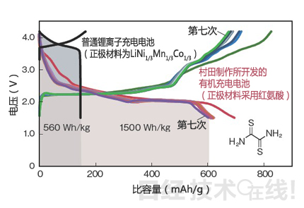 村田制作所計劃有機化合物“采用紅氨酸,力爭2020年前后實現(xiàn)業(yè)務(wù)化”(該公司)。紅氨酸如果發(fā)生四電子反應(yīng),就能實現(xiàn)890mAh/g的理論容量。在本屆電池研討會上,作為本田技術(shù)研究所與日本Carlit的共同研究成果,展示了正極材料采用紅氨酸的半電池單元的充放電特性(圖13)注7)。初次放電時的容量為750mAh/g,第二次以后穩(wěn)定在650mAh/g。反復(fù)充放電100次后也保持了430mAh/g的比容量。