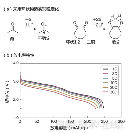 京都大學和松下開發(fā)出了正極材料采用將兩個酮連接形成環(huán)狀構(gòu)造的環(huán)狀1,2-二酮的有機充電電池(a)。支持30C的高速充放電(b)。(圖由《日經(jīng)電子》根據(jù)京都大學的資料制作)