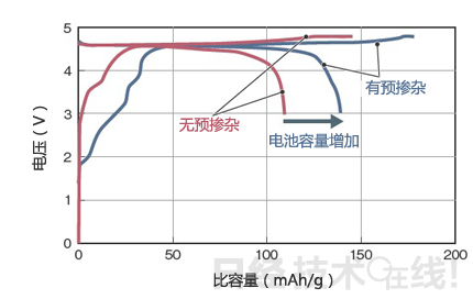 與原來的LiMn2O4相比電壓可提高0.7V左右,因此單元的能量密度可由原來的約150Wh/kg提高約30%達到200Wh/kg以上。