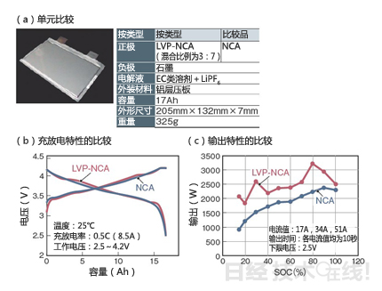 富士重工業采用將LVP與NCA按重量比3:7混合的正極試制了17Ah的層壓型單元(圖16)。能量密度為190Wh/kg(373Wh/L),平均電壓為3.64V,與僅采用NCA正極試制的單元具備基本相同的性能,同時大幅提高了輸出特性。SOC較低時的輸出特性尤為出色。富士重工業表示,通過改變混合比例,有望達到期望的輸出特性。