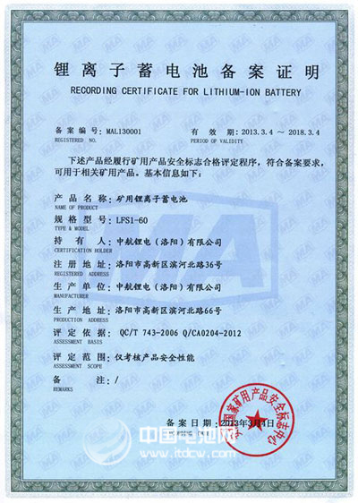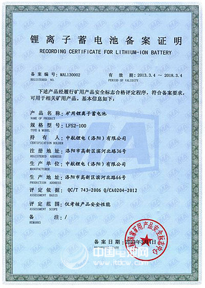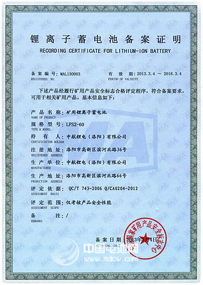 據(jù)中國電池網(wǎng)-中國電池雜志記者了解,鋰離子蓄電池因其優(yōu)異的安全性受到煤礦行業(yè)越來越多的關注,為進一步提高礦用產(chǎn)品使用的鋰離子蓄電池的安全保障,安標國家中心于2012年5月出臺了《礦用鋰離子蓄電池安全標志管理方案》,要求礦用鋰離子蓄電池必須取得安全標志備案證明才允許生產(chǎn)經(jīng)營并在井下使用,為此,中航鋰電高度重視安標備案工作。在經(jīng)過備案申請、受理、技術審查、現(xiàn)場評審、安全性能檢驗等多個階段后,公司最終成功獲得備案證明。
