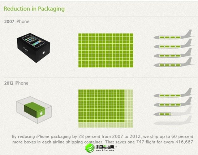 “制作更薄,更輕,以及更高效的產品,不僅可以減少產品的碳排放,而且也能讓我們可以使用更加小型的產品包裝,”蘋果公司說到,“舉個例子,和2007年的蘋果iPhone手機包裝大小相比,iPhone5的包裝形狀減小了28%。這意味著,和原來相比,每一塊運貨板上可以多裝載60%的iPhone5手機,這也意味著蘋果物流將使用更少的貨船和貨機,從某種程度上來說,這也是一種減少二氧化碳排放量的方式。”