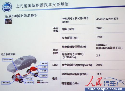 榮威550插電式混合動(dòng)力轎車是上汽基于自主品牌榮威550 車型,自主開發(fā)的混合動(dòng)力轎車。該車應(yīng)用了全新自主研發(fā)的混合動(dòng)力系統(tǒng)(包括動(dòng)力電池系統(tǒng)、電力電子箱、電驅(qū)變速箱)、整車電轉(zhuǎn)向系統(tǒng)、電空調(diào)系統(tǒng)和熱管理系統(tǒng)。與傳統(tǒng)榮威550車型相比,該車節(jié)油率超過50%,百公里綜合油耗僅為2.3L,并滿足國(guó)5排放標(biāo)準(zhǔn),已實(shí)現(xiàn)量產(chǎn)。