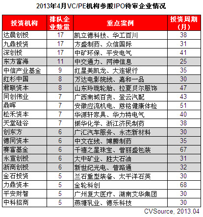 表1 截至2013年4月VC/PE參股IPO待審企業情況