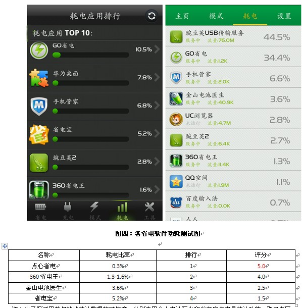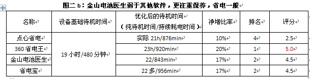 注:為了保證用參與軟件統(tǒng)計(jì)數(shù)據(jù)的可信度,分別選用金山電池醫(yī)生和省電寶典電量統(tǒng)計(jì)功能,取二者區(qū)間作為比較依據(jù)。