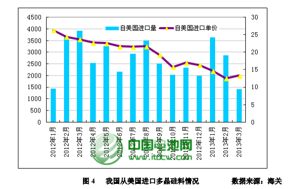 據最新海關統計數據顯示,2013 年 3 月我國多晶硅進口量為6433 噸,環比下滑 19.49%,同比大幅下滑 15.93%;進口單價方面,3 月份多晶硅進口均價較 2 月有所反彈,亦是 2013 年以來首次回升,為 19.39 美元/千克,環比增長 9.55%,同比下降 31%,較 2012 年全年均價下滑 23.5%。