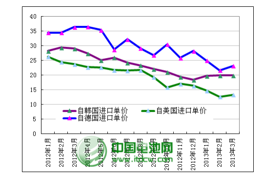 據 3 月份分國別進口數據顯示,韓國、美國和德國是三家最大的進口國家,自韓國、美國、德國進口量占總進口量的 83.67%。其中從韓國進口量為 2184 噸,占總進口量的 33.95%,是除 2012 年 1 月和 6 月外進口量又一次超過美國和德國,位居榜首;從美國進口量為 1410 噸,占總進口量的 21.91%;德國進口量為 1789噸,占總進口量的 27.8%;其他地區進口量為 1051 噸,僅占總量的 16.3%。從進口單價來看,韓國 19.88 美元/千克、美國 13.34 美元/千克、德國 23.16 美元/千克。