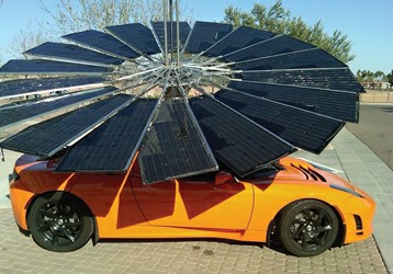 “蓮花”太陽能移動充電器由君主能源公司首席執行官、亞利桑那州立大學教授約瑟夫·休伊研制,他上個月底將其擺放在自己橘色的特斯拉跑車上,在菲尼克斯(鳳凰城)的大街上向過往行人和車輛展示。這種新的太陽能移動充電系統十分輕巧,完全可以用小的車輛運送。休伊說,他之所以選擇這種設計,在于從蓮花那兒受到啟示,激勵自己把笨重固定的太陽能電池陣列變成輕巧便攜的折疊式充電設備。