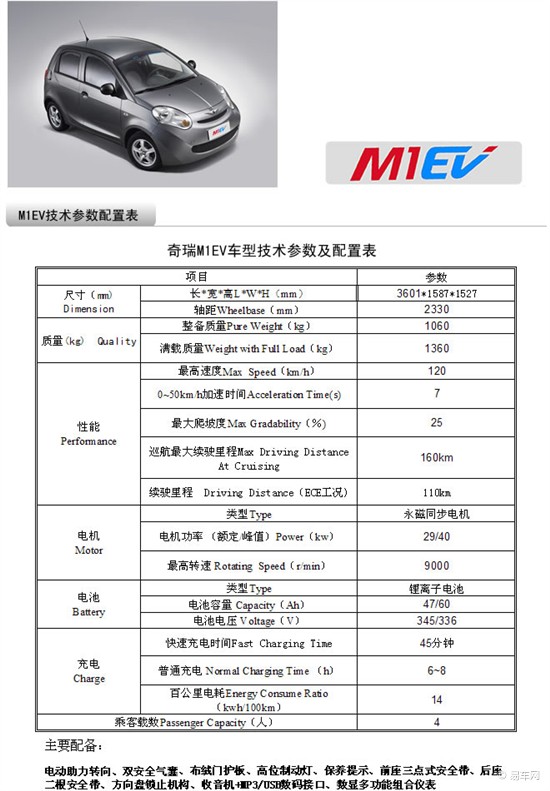 奇瑞M1EV純電動汽車在奇瑞M1平臺的基礎上開發的一款純電動車,整車造型完美、線條流暢、小巧玲瓏、做工精細。該車配備了高效率的永磁同步電機,高性能的磷酸鐵鋰電池;安全方面配備了安全氣囊,標配ABS防抱死系統等配置,保證了駕駛的安全性和舒適性;配備了EPS,電動制冷空調和制熱空調,無級變速器等智能駕控系統。純電動驅動系統體現了最新的科技成果,真正實現了零排放、零污染、純電動行駛。其主要技術特點如下: