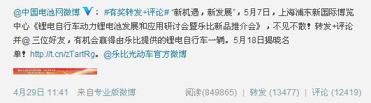 據(jù)統(tǒng)計,參與本次“轉(zhuǎn)發(fā)+評論”活動的網(wǎng)友轉(zhuǎn)發(fā)達(dá)13471次,評論達(dá)12413次,微博閱讀展示與曝光量達(dá)846254次。活動結(jié)束后,仍有不少網(wǎng)友繼續(xù)轉(zhuǎn)發(fā)和評論,不少網(wǎng)友希望中國電池網(wǎng)多舉辦一些這樣的活動來推廣環(huán)保、綠色、低碳的鋰電自行車。福建省自行車電動車行業(yè)協(xié)會會長、樂比(上海)科技有限公司董事長林曦表示,讓更多的人通過微活動、通過中國電池網(wǎng)了解樂比,十分有意義,樂比會在今后多舉辦一些消費(fèi)者、網(wǎng)友能互動、參與的有意義的活動,讓更多的人了解鋰電自行車、鋰電池行業(yè)。