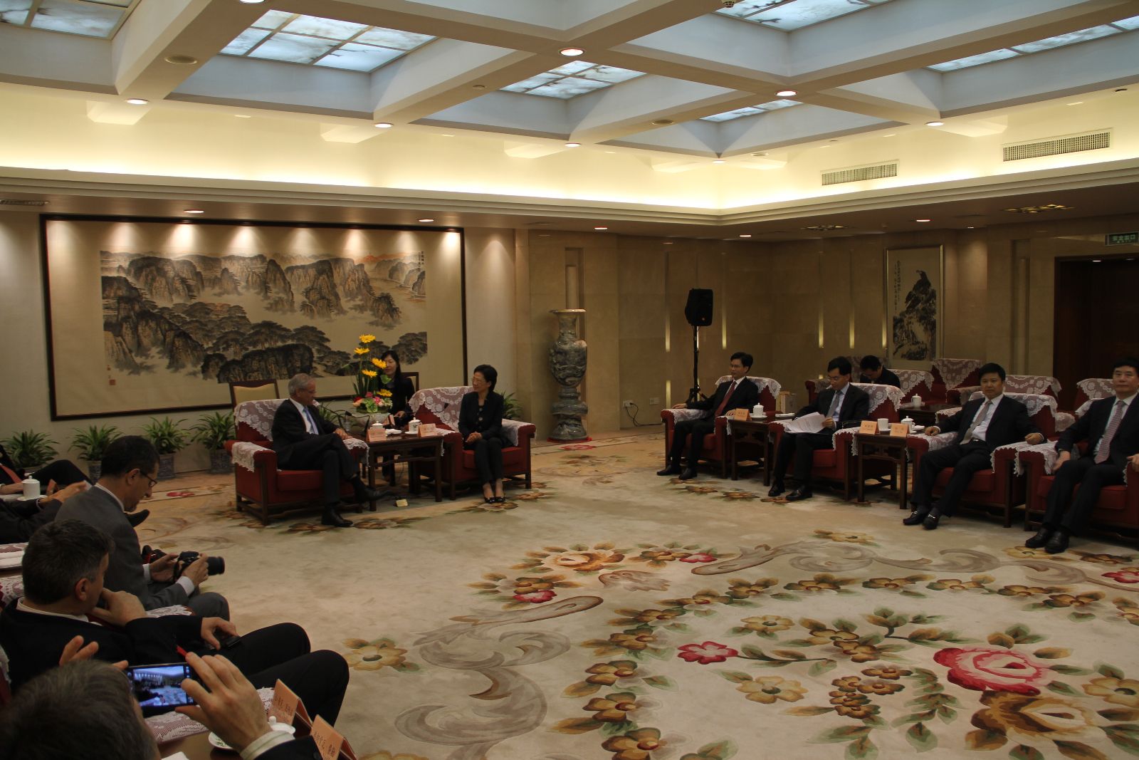 梁黎明副省長在浙江省人民大會堂會見了瑞士弗利堡州副州長比特·馮郎特一行,省商務廳韓杰副廳長、省外事辦顧建新副主任、眾泰汽車吳建中董事長等參加會見。