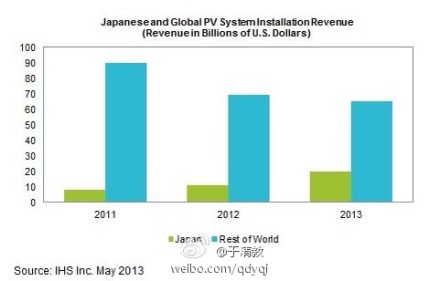 日本太陽能安裝量在2013年首季度同比上升270%。以年收入進行衡量,日本今年將超越德國成為世界上最大的太陽能光伏市場。