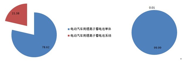 圖2 2013年1-4月我國出口(左)和進口(右)鋰電池產(chǎn)品構(gòu)成情況