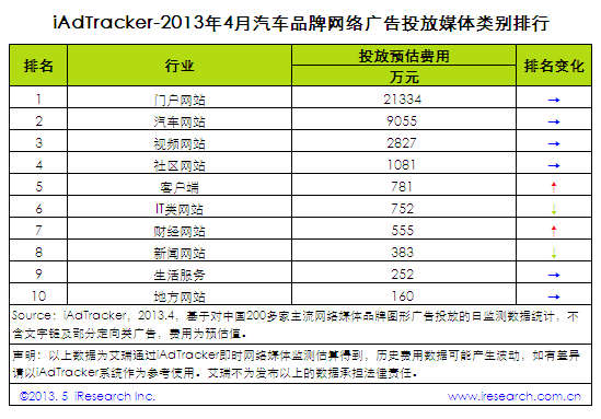 2013年4月,汽車品牌網(wǎng)絡廣告總投放費用達3.7億元。其中,DS投放費用達1883萬元,位居第一;雪佛蘭投放費用達1662萬元,位居第二;奧迪投放費用達1541萬元,位居第三。 最新數(shù)據(jù)顯示,2013年4月,門戶網(wǎng)站和汽車網(wǎng)站仍是汽車品牌網(wǎng)絡廣告投放的首選平臺。其中,門戶網(wǎng)站投放費用達2.1 億元,占總投放費