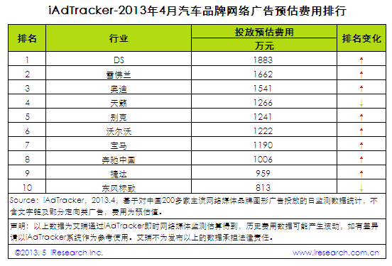 2013年4月,汽車品牌網(wǎng)絡廣告總投放費用達3.7億元。其中,DS投放費用達1883萬元,位居第一;雪佛蘭投放費用達1662萬元,位居第二;奧迪投放費用達1541萬元,位居第三。