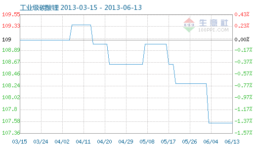 6月13日工業(yè)級碳酸鋰商品指數(shù)為107.55,與昨日持平,較周期內(nèi)最高點(diǎn)112.10點(diǎn)(2012-11-04)下降了4.06%,較2012年01月05日最低點(diǎn)98.94點(diǎn)上漲了8.70%。(注:周期指2011-09-01至今)