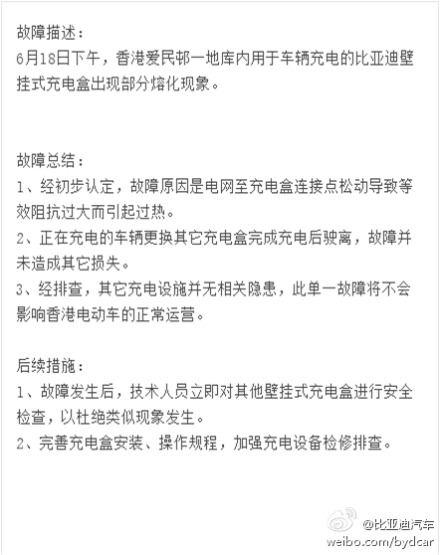 據香港《蘋果日報》6月18日報道,比亞迪電動的士E6在進入香港出租車市場僅一個月之后,即發生充電時爆炸事故。今天(6月20日)比亞迪官方發表官方聲明解釋此事件稱:故障原因是電網至充電盒連接點松動導致等效阻抗過大而引起過熱,其它充電器并不存在此故障,此單一故障不會影響香港電動車的正常運營。