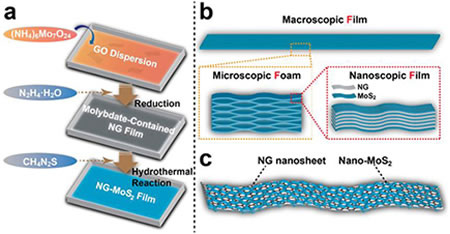 圖1.(a)NG-MoS2復合材料的制備示意圖,(b)NG-MoS2的“薄膜-泡沫-薄膜”分級結構示意圖,以及(c)NG納米片雙面負載納米MoS2的三明治結構示意圖。
