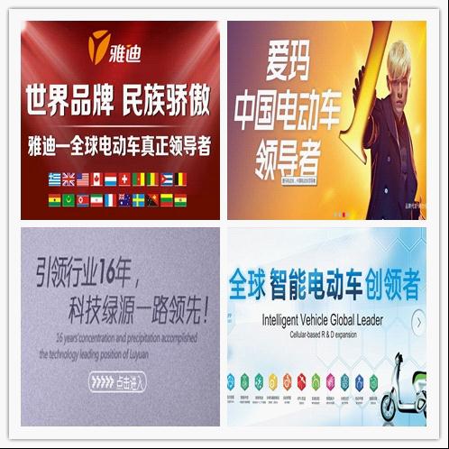 近年來,電動車市場第一陣營中的愛瑪、雅迪、新日、綠源四個品牌對電動車行業“領導者、龍頭、第一名”頭銜的爭奪日趨激烈。愛瑪稱是“中國電動車領導者”,雅迪宣傳是“全球電動車真正領導者”,新日稱自己是“中國電動車龍頭品牌”,綠源則宣布自己是“行業十大品牌第一名”。